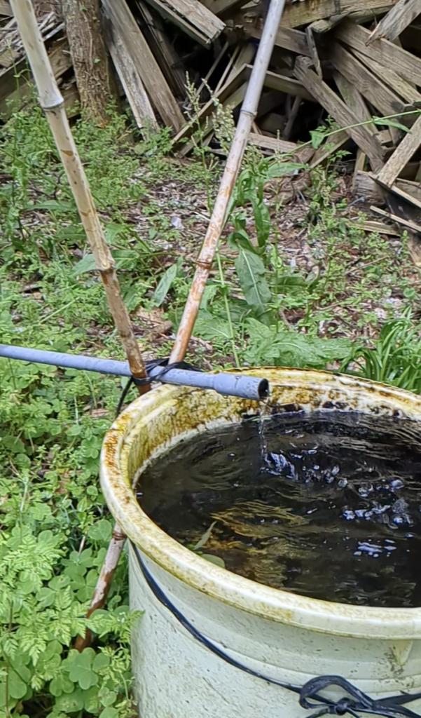 原木しいたけやこんにゃく芋にたまには水をやらないとって事で、昔ミカン畑だった山に水を引いていた場所を復活させ、ホースでつないで水を確保しておりますが・・・