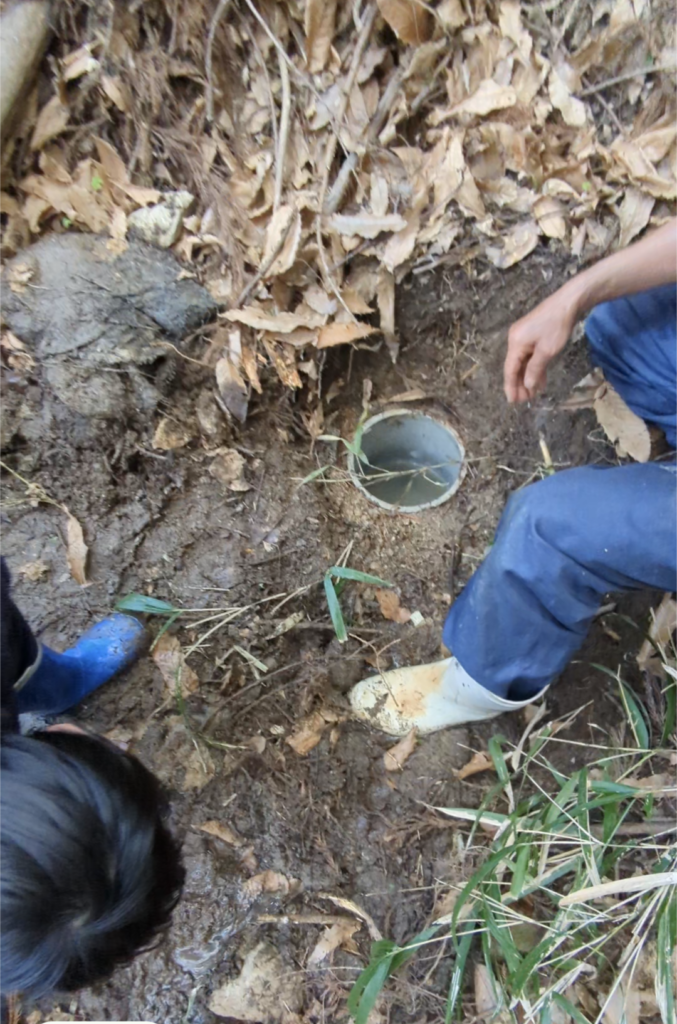 さてさて上に塞いでる泥をどかして、ホースの中に詰まった泥を取り出さないと・・・